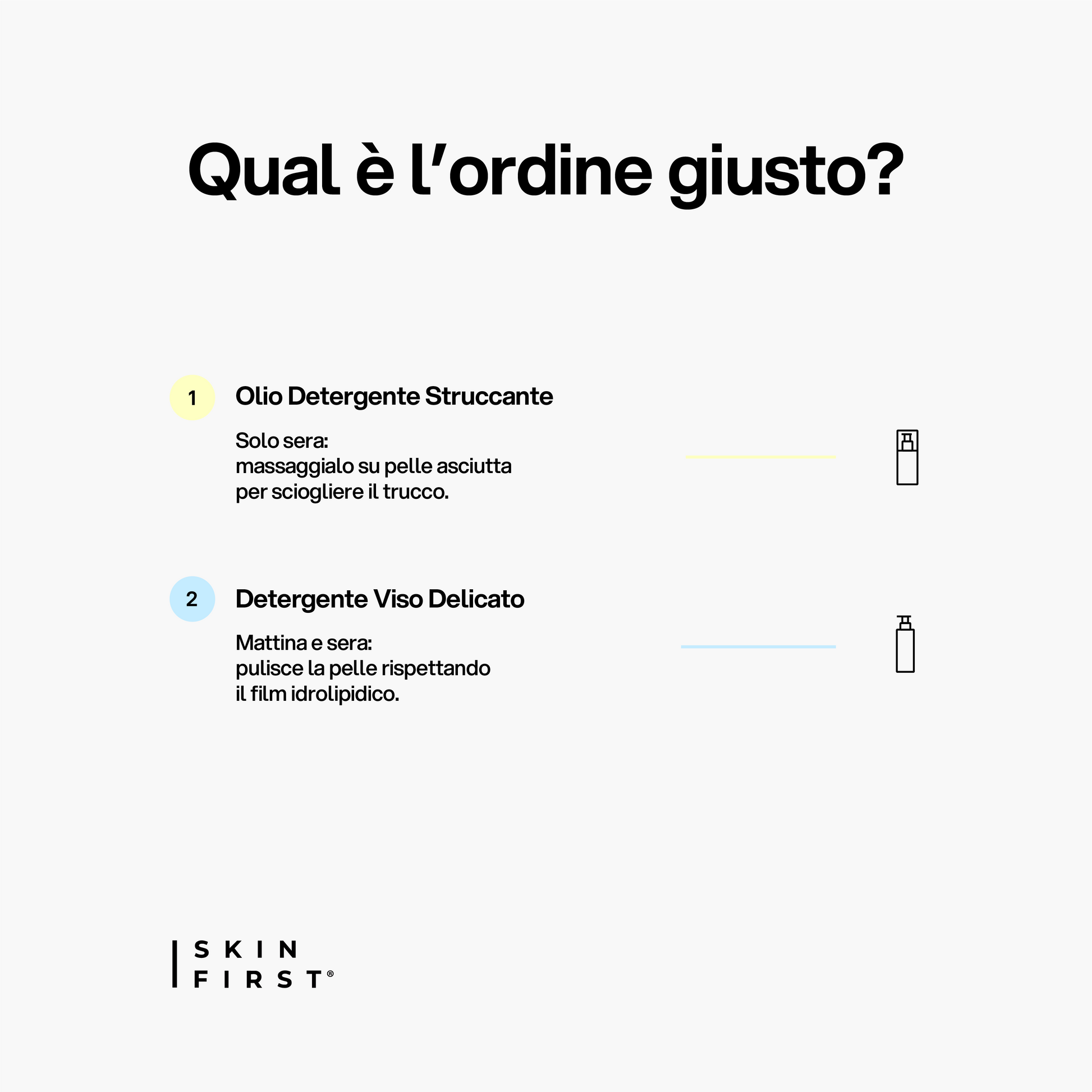 La sera inizia sempre con l’Olio Detergente Struccante: massaggialo su pelle asciutta per sciogliere tutto il trucco. A seguire, inumidisci il viso e applica il Detergente Viso Delicato, massaggiando per 20-30 secondi prima di risciacquare con acqua tiepida. Al mattino, usa solo il Detergente Viso Delicato su pelle umida: massaggia per 20 secondi e risciacqua con acqua tiepida.