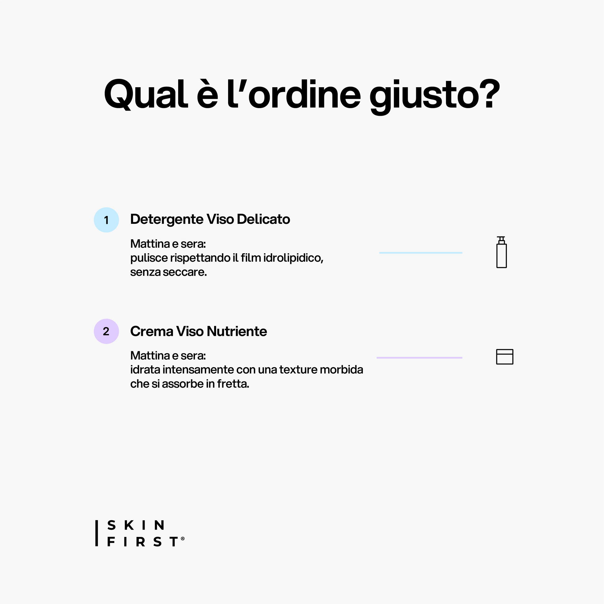 Usa il Detergente Viso Delicato al mattino su pelle inumidita e massaggia per almeno 20 secondi. Successivamente applica la Crema Viso Nutriente: si assorbe in fretta e lascia subito la pelle più morbida e confortevole.