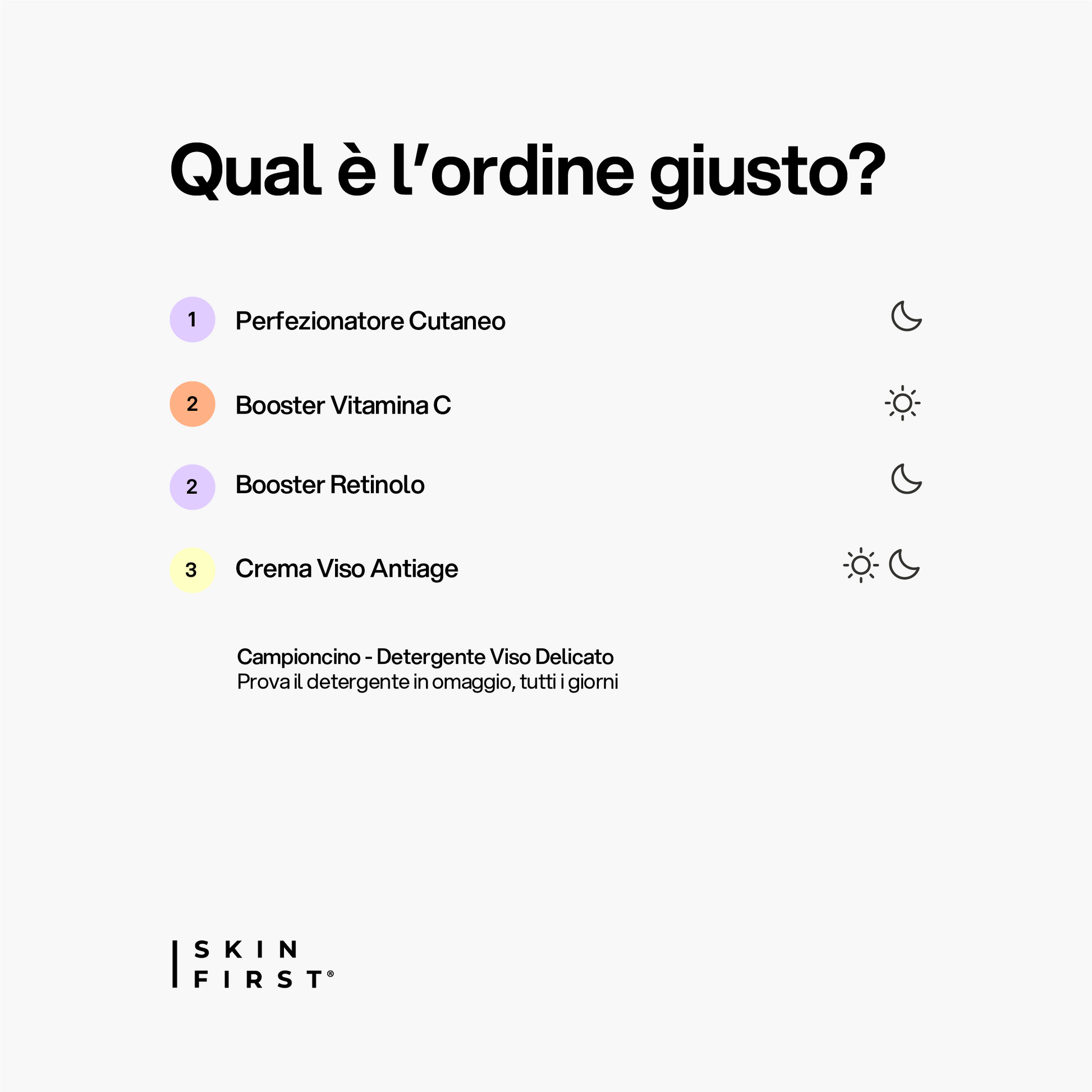 • Solo la sera (prima del booster), applica 4-5 gocce di Perfezionatore Cutaneo, senza risciacquare.